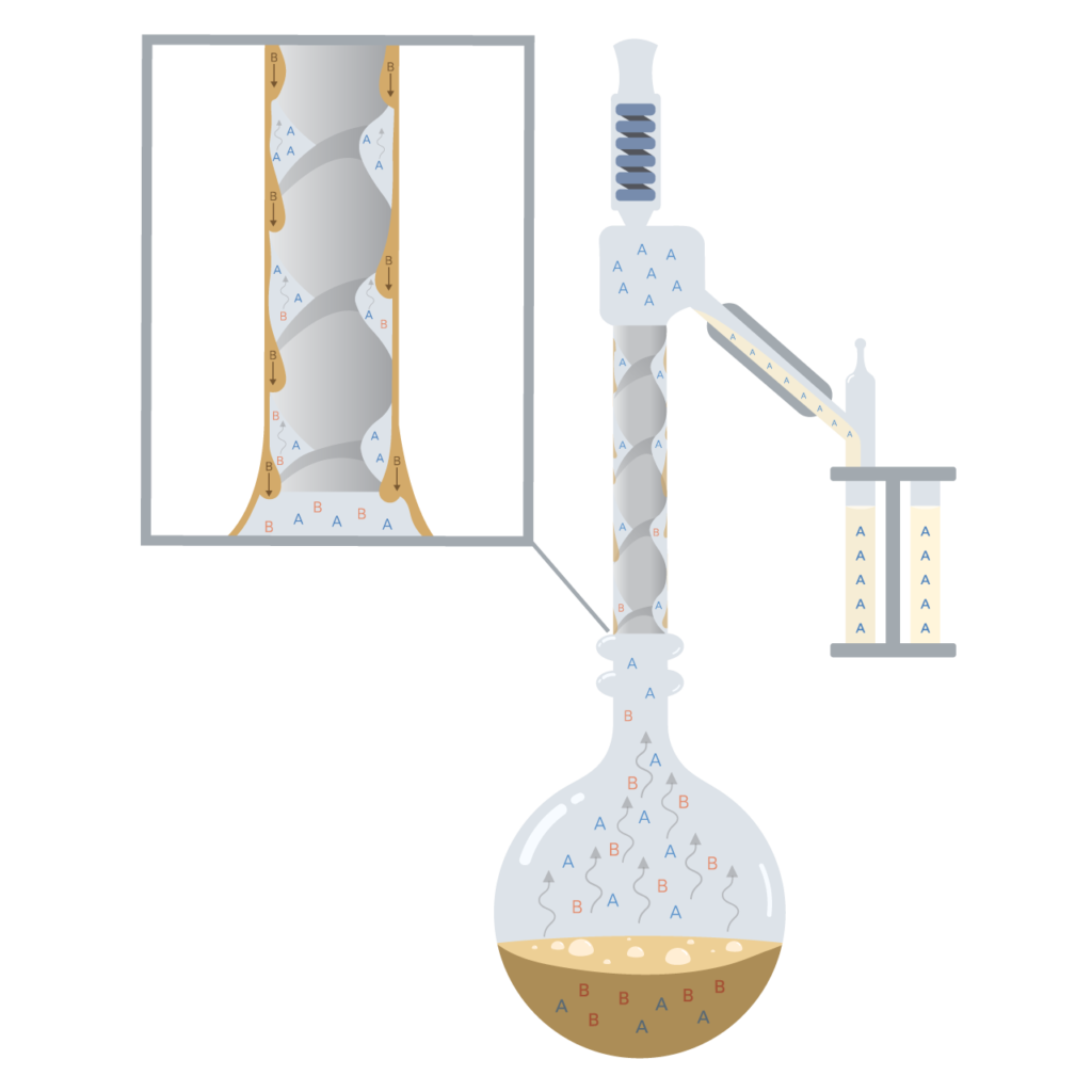 Der Kontakt zwischen den aufsteigenden Dämpfen und dem rückfliessenden Kondensat konzentriert die niedriger siedende Komponente im Dampf. Durch den Kontakt zwischen Flüssigkeit und Dampf verbessert sich die bessere Trennung.