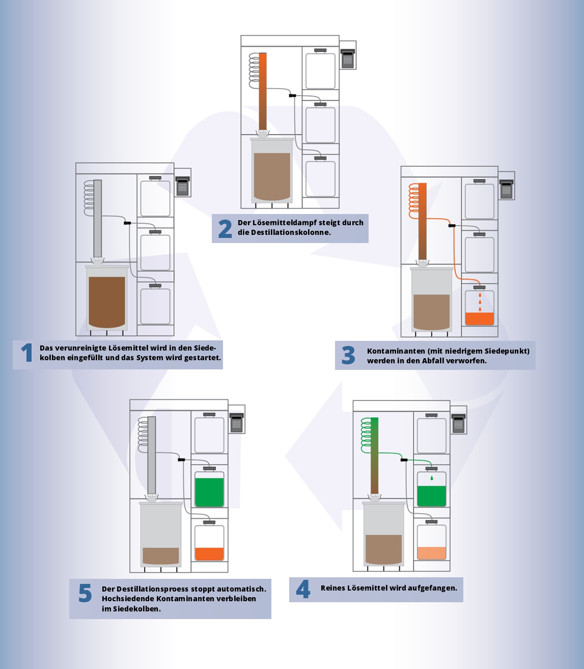 Durch Destillation können verunreinigte Lösungsmittel zurückgewonnen und wiederverwendet werden. Dabei werden Verschmutzungen wie Harze, Polymere und andere Stoffe vom Lösungsmittel getrennt. Die Verschmutzungen bleiben im Siedebehälter zurück. Um aufwändige Reinigungsarbeiten zu vermeiden, können hitze-. und lösungsmittelbeständige Destillationsbeutel in den Siedebehälter eingesetzt werden. Nach Abschluss des Destillationsvorgangs können sie mit den Destillationsrückständen einfach entnommen werden.