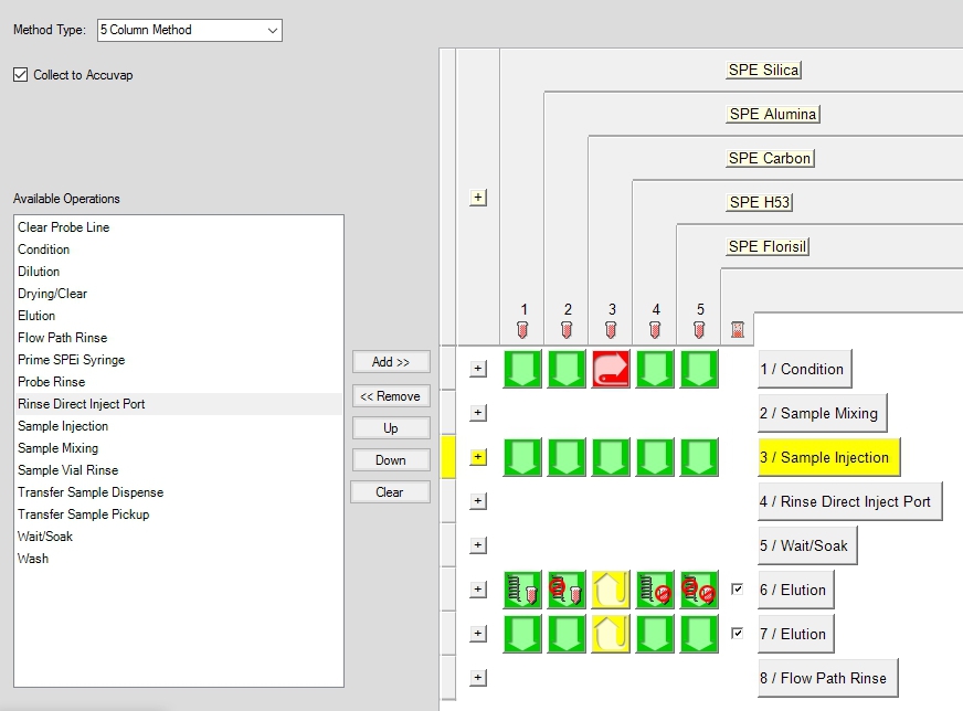 - SPE: Konditionieren, Probenaufgabe, Verdünnen, Durchmischen, Waschen, Trocknen, Eluieren, Umkehreluieren, Fraktionieren, Spülen, Probentransfer